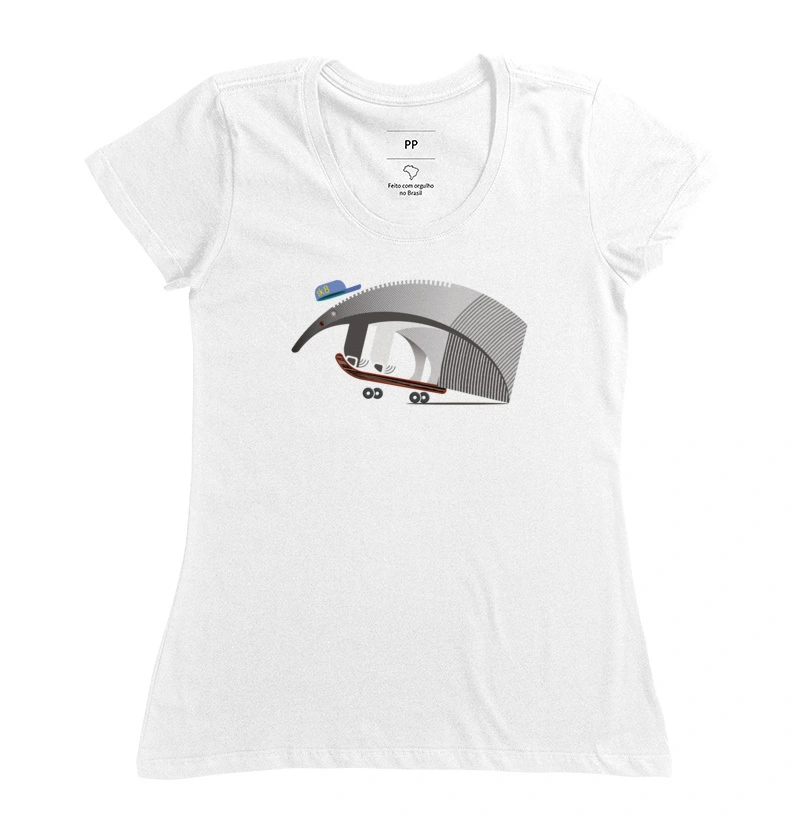 Outro animal muito especial dando bandeira em um esporte olímpico. #ParaTodosVerem: A estampa ocupa o peito de uma camiseta branca e traz um desenho de um tamanduá andando de skate. Ele tem todas patas apoiadas na prancha em uma leve manobra que faz seu boné onde se lê SK8 voar da sua cabeça. O animal está em vista lateral em movimento para a esquerda do espectador. O desenho traz os detalhes da pelagem do animal com as listras negra e branca laterais características, cauda peluda e longas unhas. O desenho tem tons de cinza no corpo e textura pontilhada para sombreamento. Arte de Ronald Rosa
