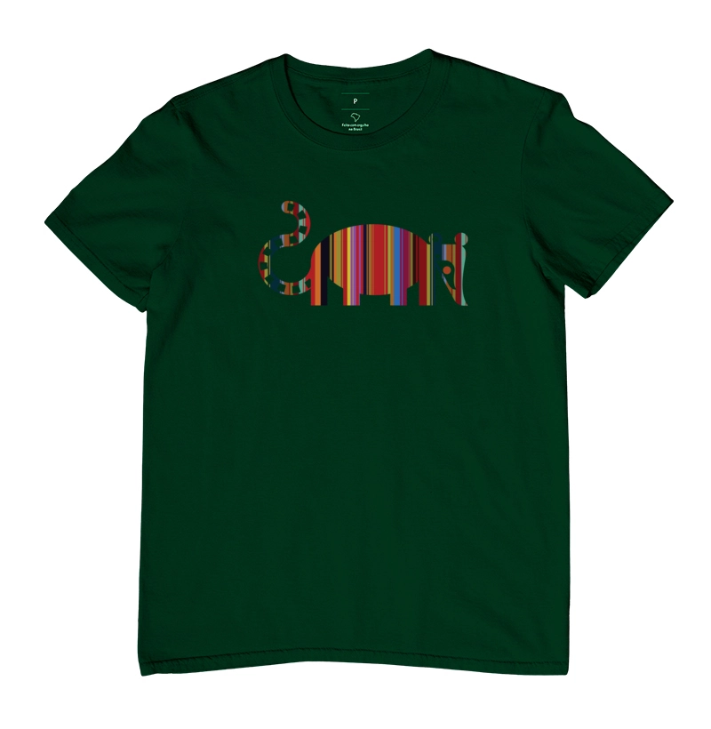 Pictograma de um quati multi colorido e estiloso. Pra não dizer chique. Que bichinho mais bonito! Lá na floresta. #PraTodosVerem: o desenho ocupa o peito de camiseta branca ou preta e traz uma silhueta bem simplificada e geométrica que ilustra um quati com sua cauda anelada. Anéis e detalhes do rosto do animal são elementos vazados no corpo do desenho. Todo o desenho é um sólido único com a cabeça do animal à direita do espectador, corpo arredondado e com a cauda fazendo curva em um S invertido. O desenho é todo preenchido por sequência de listras finas em várias cores diferentes paralelas verticalmente. Arte de Ronald Rosa